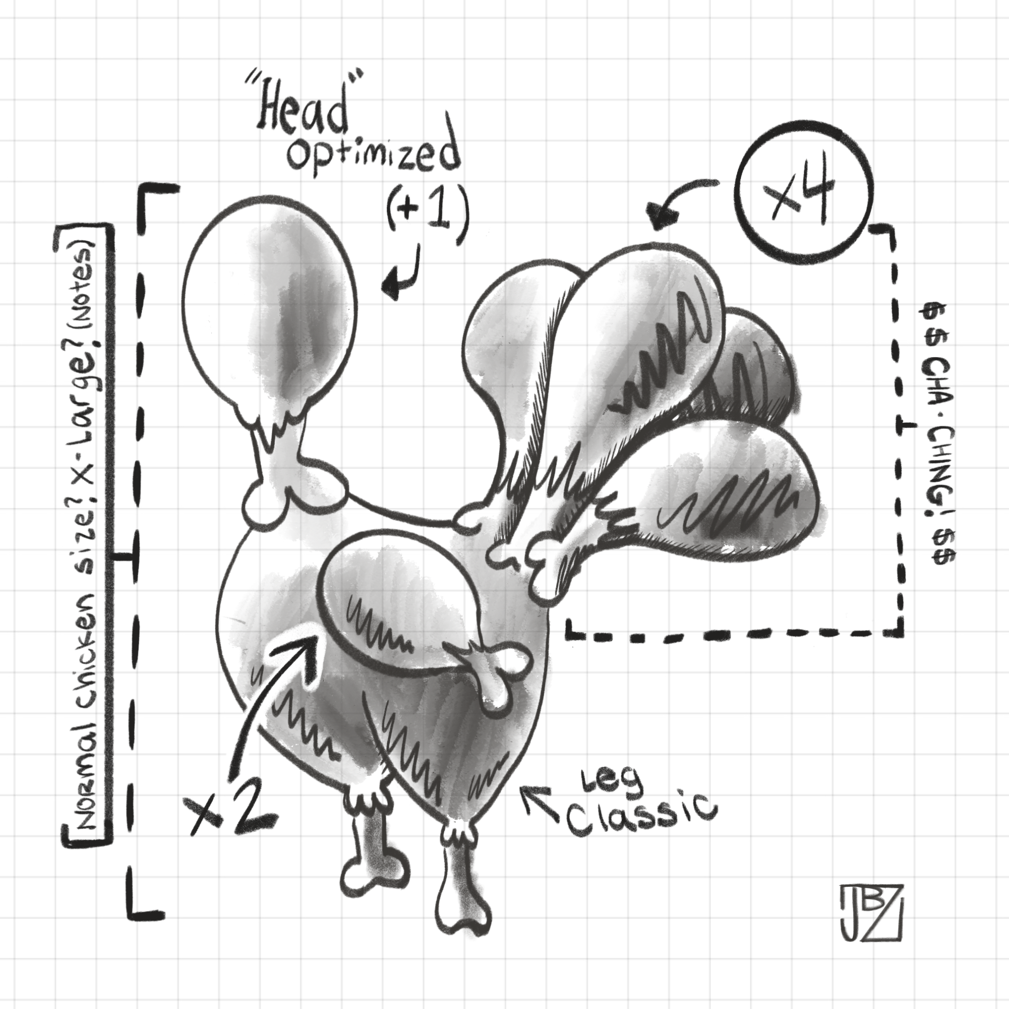 14 years seemed a bit long, so the P.F. joined the team to collaborate in real time. The team began to sketch the concept as they understood it. They asked the P.F. “do you want the chicken to have 8 pieces total — 4 legs and 4 thighs — or do you want the chicken to have 8 leg-thigh combinations?” They showed the P.F. their sketch (see above.)